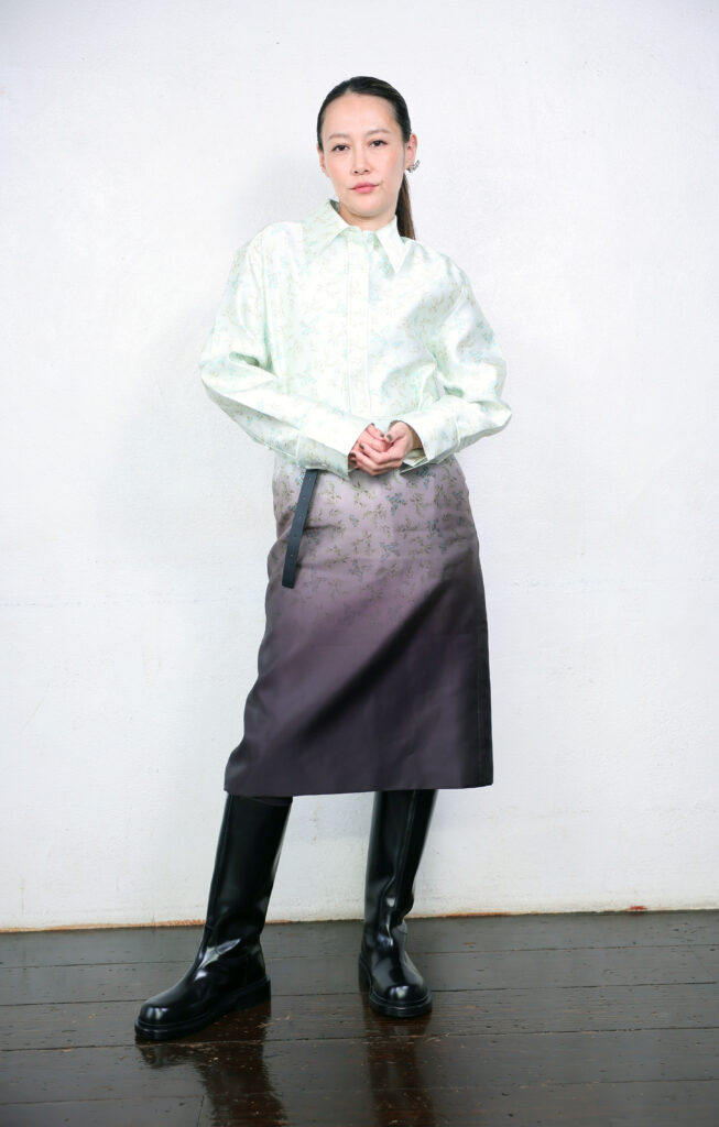 透明な肌、落ち着いた眼差し。菊地凛子さんは「クールビューティー」の言葉がぴったりの大人の女性だ。ハウススタジオでの取材には、肩から裾にかけてパールホワイト、パールグリーン、ブラックへと変わるグラデーションが美しいワンピース姿で現れた。凜(りん)とした佇まいに「孤高のクジャクのようだ」と思った。自然光が入ってくるスタジオでの撮影はまとう光にもこだわった。太陽の位置を見てカメラマンと構図について話す姿は高いレベルを知る人の厳しさをのぞかせた。だが、インタビューでは「あはは」と人懐っこい笑顔。どんな役柄も演じる魅力はこのギャップにあると確信した。